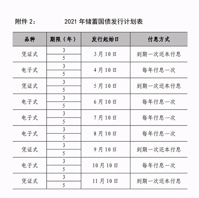 2021年计划发行电子式国债在4月、6月、7月、8月、10月有5次发行计划。凭证式国债发行时间为3月、5月、9月、11月4次发行计划。