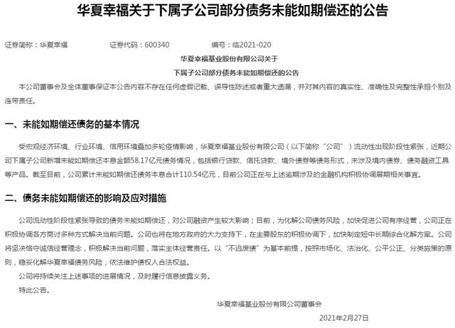 2月26日晚间,华夏幸福公告称,截至目前公司累计未能如期偿还债务本息合计110.54亿元,正在与涉及的金融机构协调展期事宜。