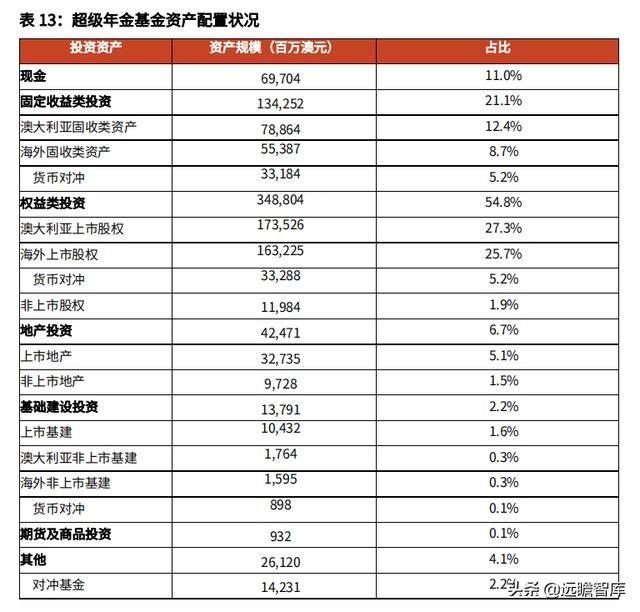 除了传统养老金的权益类及固收类配置外,超级年金还额外配置了地产、基础建设投资资产以及衍生品等,差异化的投资满足了保值增值的需要,货币对冲与海外资产的配置进一步分散了投资风险。