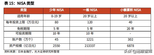 日本个人储蓄账户计划 NISA 是由日本金融厅推行的个人储蓄账户,旨在鼓励居民将闲置资金进行多元化投资,从而促进资本市场发展,因此 NISA 本质上是为个人储蓄投资于资本市场而设立的免税账户,投资收益同样享受免除 20.315%资本利得税的优惠。截至 2020 年,NISA 的资产规模为 22.02 万亿日元,同比增长 21.11%。