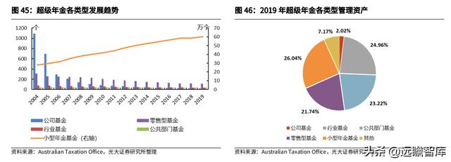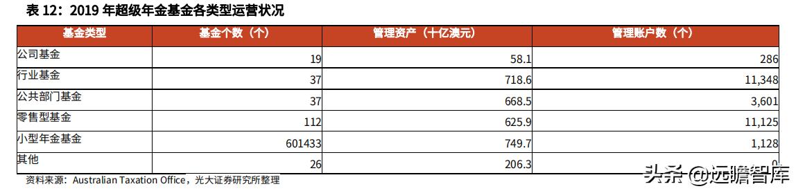 (5)小型年金基金:包含不足 5 人基金、个人基金和自营型超级年金(SMSF)。从基金数目来看,公司基金个数下滑,小型年金基金的基金个数持续走高。