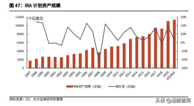 从 IRA 的资产配置来看,共同基金是最重要的部分,在 IRA 整体配置中占比由 1975 年的 1%上涨至 2020 年 Q3 的 43%,主要起到稳定资本市场的作用;商业银行存款占比下降明显,寿险公司的保险产品占比相对稳定,近年来维持在 5%左右。