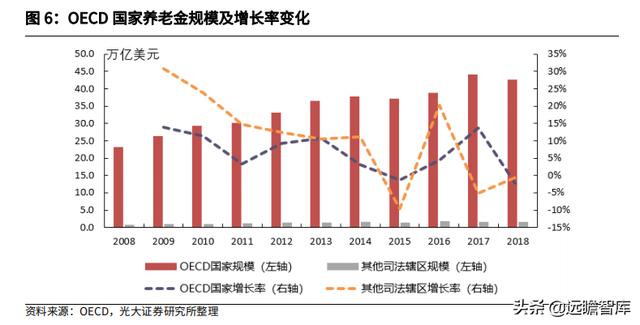 整体来看,全球养老金资产规模呈稳步增长趋势。OECD 数据显示,2008-2018 年间全球养老金规模由 23.6 万亿美元增长至 44.1 万亿美元,其中 OECD 国家养老金规模从 2008 年 23 万亿美元增长至 2018 年 42.5 万亿美元。