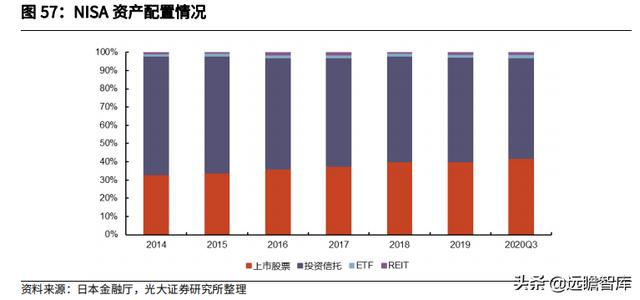 截至 2020 年 Q3,上市股票/投资信托的配置比例分别为 41.9%/55.3%,交易型开放式指数基 金(ETF)以及房地产信托投资基金(REIT)的配置相对较少,整体而言基本维持在 2%-3%左右,体现了 NISA 参与者更偏向于风险收益型。