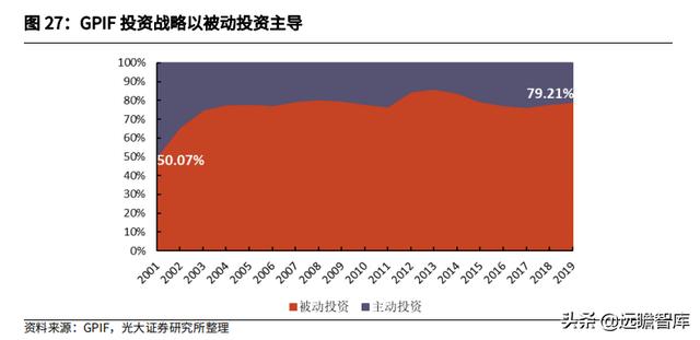 GPIF 主要采取被动投资战略以确保资金长期安全性和减少养老金交易对市场的影响,至 2019 年 GPIF 共有 79.21%的资产采取被动投资战略。