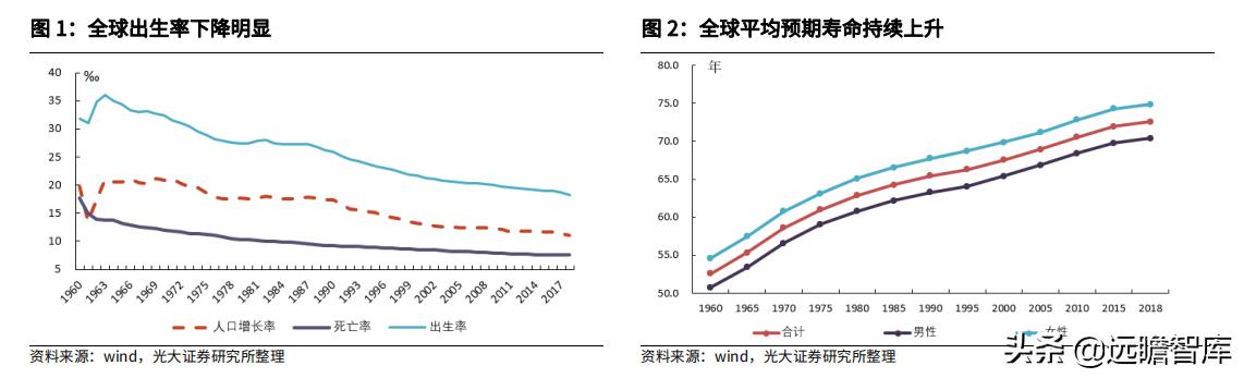 全球出生率下降明显,平均预期寿命持续上升。近年来,全球出生率持续下降,从 1960 年 31.75‰下降至 2018 年 18.17‰(1 年内平均每千人中出生 18.17 人),死亡率维持相对稳定,人口增长率不断下滑;全球人口平均寿命逐渐延长,全球平均预期寿命从 1960 年 52.58 岁延长至 2018 年 72.56 岁,世界人口结构不断向老龄化发展。