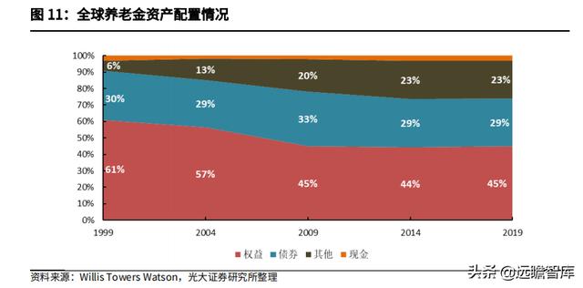 过去 20 年间,全球 Top7 国家的养老金资产配置中,权益类资产配置比例从 61%下降至 45%,固定收益类及现金类资产配置占比基本保持不变,房地产等其他替代资产由 6%上升至 23%,体现了养老金资产配置对于多元化以及保值增值的需求。