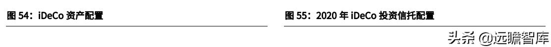 从资产配置来看,iDeCo 的资金主要投向储蓄类存款、保险(包含生命保险和损失保险)以及投资信托类资产。从 2020 年的数据来看,投资信托类资产配置最高,占比达到 48.1%,存款类和保险类的资产占比分别为 36.1%/15.6%。在投向投资信托类的资产中,权益类占比最高,合计占总资产比重 39.9%,固收类合计占比为 21.8%。