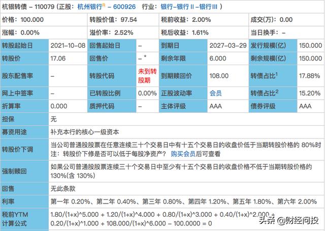 杭银转债,结合AAA评级、相似的转债、正股质地等综合因素分析预计开盘合理价为110元左右。
