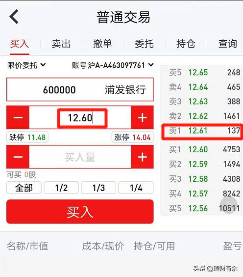 如果行情剧烈变动,比如突然拉升或者猛烈下跌的时候,这样的限价交易往往不能成功。因为股票的交易遵循“价格优先,时间优先”的原则,你设置的价格是12.60,有人设置的12.61,他的就会比你先成交,如果都是12.61,当股价降到这个价位的时候,先下单的人会优先成交。如果想要及时成交,你有两种选择,一种是买入的时候把价格设高一些,比如上面的卖1是12.61,你把买价设为12.62,一般就可以立即成交,如果卖1的数量足够,你还是会以12.61的价格成交。另一种方法是选择市价委托,在买入旁边有一个限价委托的按钮,点击进去,可以选择“市价委托”。
