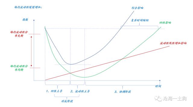 绿线代表了流动性分布的影响,红线代表了总量流动性增加的影响,蓝线是他们二者的合力。