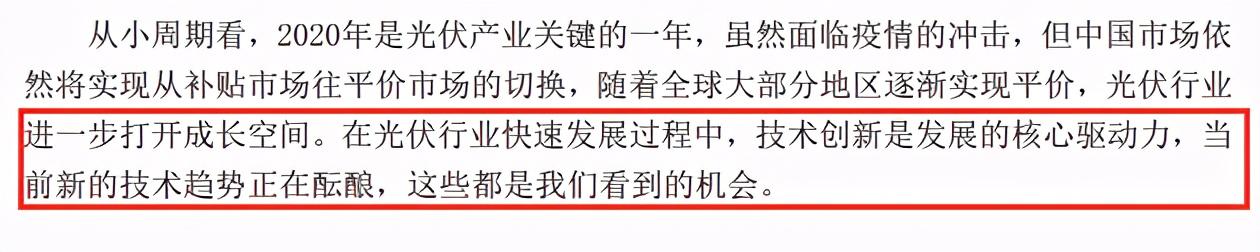 此外,她对光伏板块的观点是“虽然2020光伏受到疫情冲击,但中国市场依然将实现从补贴市场往平价市场的切换,随着全球大部分地区逐渐实现平价,光伏行业进一步打开成长空间。”