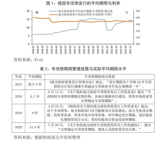 第二,新增专项债发行期限不断延长,利率水平稳中有降。一方面,2015年至2018年发行专项债的平均期限低于6年,2019年4月财政部要求逐步提高长期债券发行占比,更好匹配项目资金需求和期限,带动当年发行专项债的平均期限增加至9年左右,2020年以后新增专项债的期限快速上升至10年以上。一是由于2015年后发行专项债的期限以3年、5年为主,在2019年前后陆续到期,2021年达到偿债高峰,增加了地方政府短期偿债压力。二是不少项目投资和建设周期较长,需持续投入资金才能带来后续经营收益,如果专项债期限较短容易产生期限错配风险。另一方面,专项债发行平均利率逐步下行。2019年我国货币政策放松,央行降准3次、降息4次,专项债发行平均利率较2018年的4%左右下降约0.5个百分点。2020年受疫情影响,经济预期回落叠加央行实行宽松货币政策,专项债发行平均利率从1月的3.5%逐步降至7月的3.34%,随着下半年经济快速复苏、整体融资需求增加,专项债发行平均利率逐步回升。2021年四季度经济下行压力明显增加,货币政策宽松力度加大,专项债发行平均利率小幅下行。