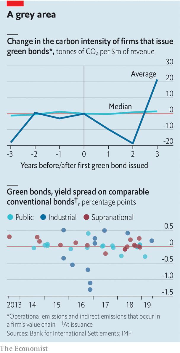 然而,由各国中央银行组成的国际清算银行的一项新研究对绿色债券的目的提出了疑问。研究人员调查了2015年至2018年发行绿色债券的200多家大型企业,发现,绿色债券发行量最多的企业往往是最为节能的,也就是说,在一定的收入水平下,他们排放的碳数量最少。超过70%的债券发行企业的碳排放强度相当于日用消费品企业(如宝洁),甚至还更少。大型污染企业很少发行此类债券,因为它们担心被指责为“洗绿”,同时这些企业的债券将被排除在绿色基金之外。