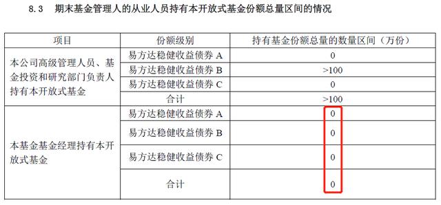 另外易方达稳健收益债券基金的不同是基金经理助理有一堆:纪玲云(固定收益分类资产研究管理部负责人)、李一硕(固定收益特定策略投资部负责人)、胡文伯、刘柱。而且让我稍感意外的是本基金的基金经理无本产品持仓。结合这两点,胡剑作为副总,在管资产超一千两百亿,自己的代表作都没有持仓,且配置了4位基金经理助理,我不禁有个疑惑:他会不会只是挂个名?