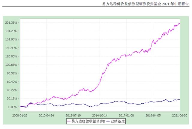 我们在半年报中可以看到该产品的业绩基准是“中债新综合财富指数收益率* 90% 沪深 300 指数收益率 *10%”,同时我们看到在2020年7月9日前的业绩基准是“中债总指数(全价)”。不得不说这只基金的历史业绩走势曲线(详见下图)真是非常的好看,属于买了能安心睡觉的那类。